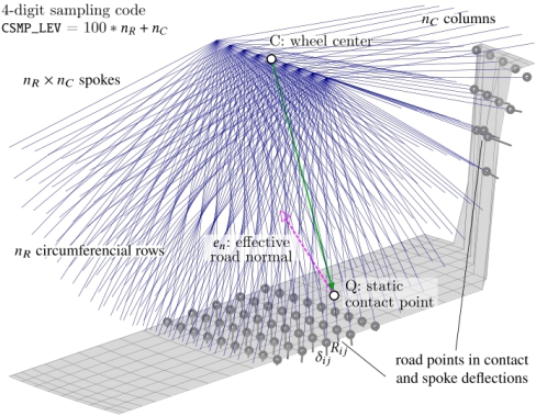 TMeasy 6.1 combines the standard and the extended version of the TMeasy tire model by a model flag which is provided in the tire parameter file. Version 7.2 provides an extended contact calculation that uses individual spokes to sample extreme obstacles and arbitrary road roughness. This spoke-sampling mode enables TMeasy to process soft-soil roads as well.